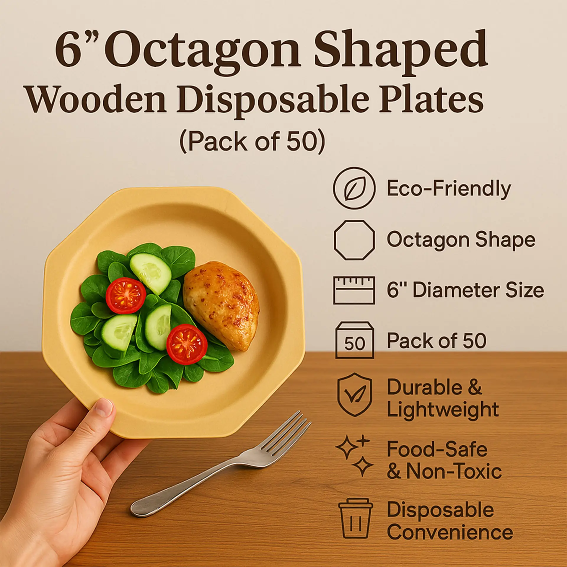 6″ Octagon Shaped Wooden Disposable Plates ( Pack of 50)