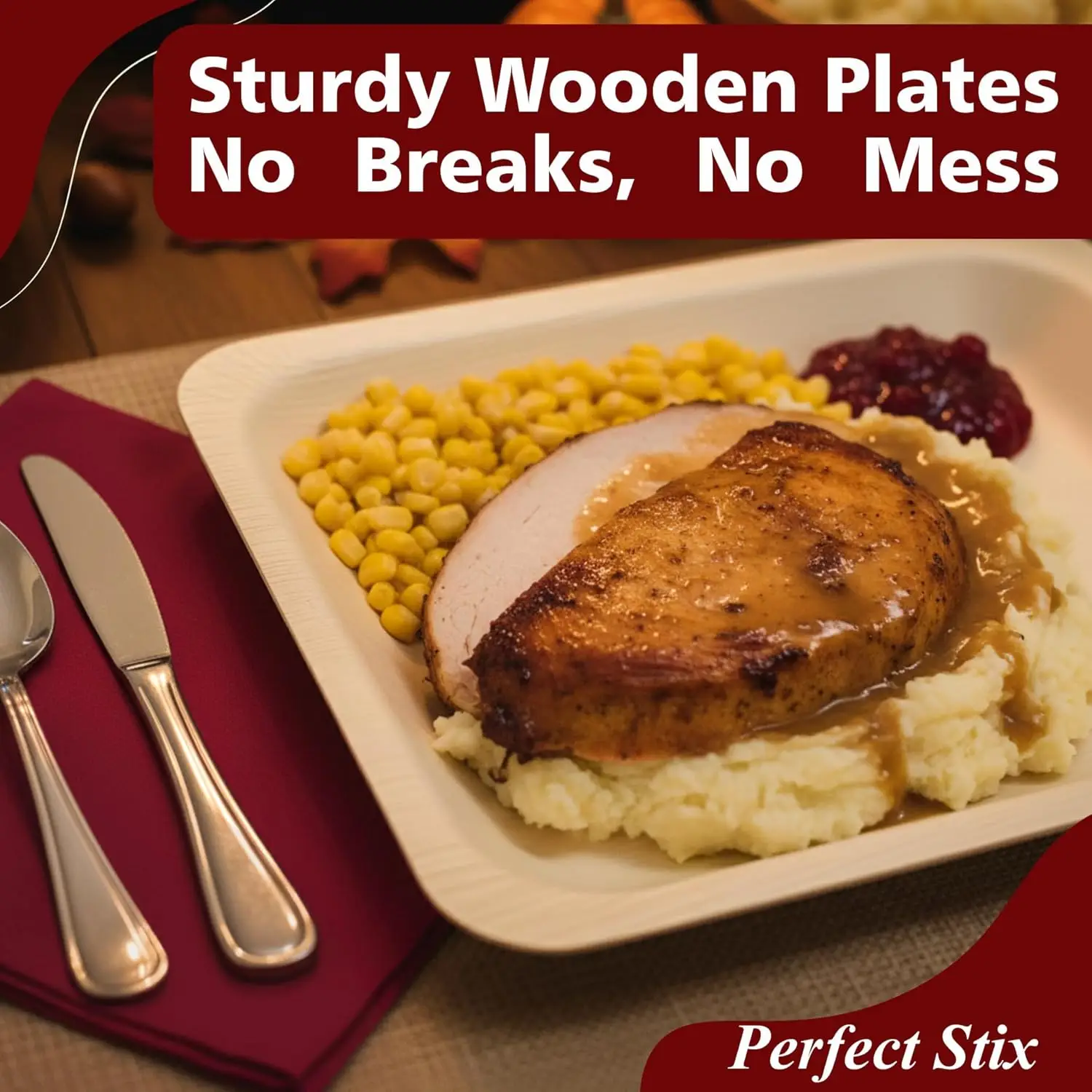Perfect Stix Thanksgiving Plates and Napkins Set – 25 Large 10-Inch & 25 Small 7-Inch Eco-Friendly Wooden Plates with 50 Burgundy 2-Ply Dinner Napkins –Thanksgiving & Friendsgiving Gatherings